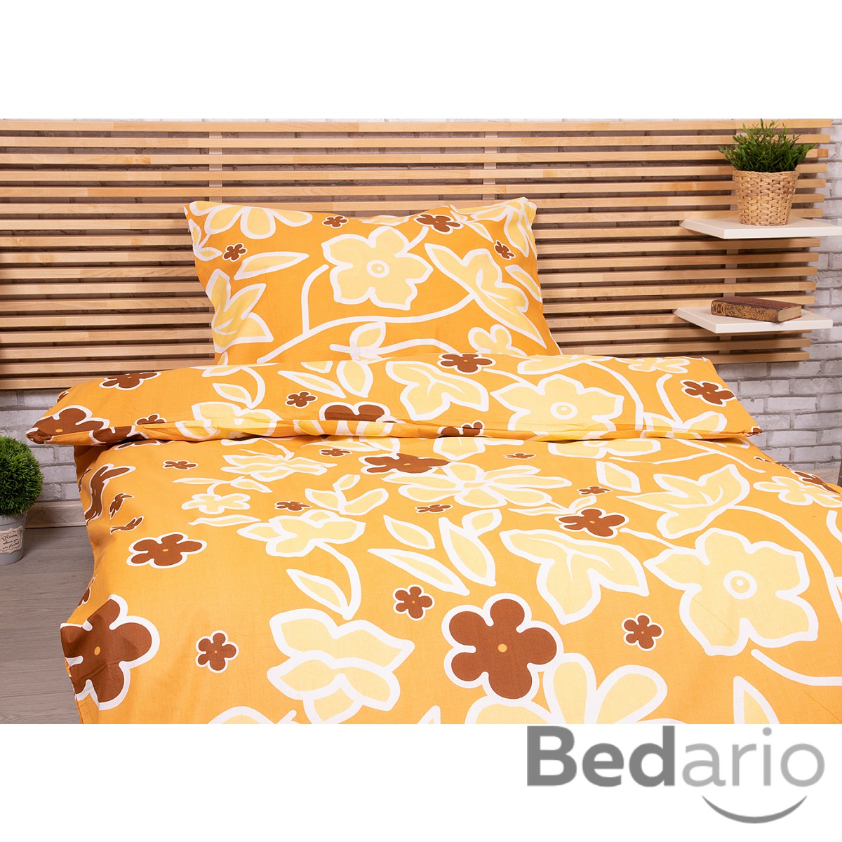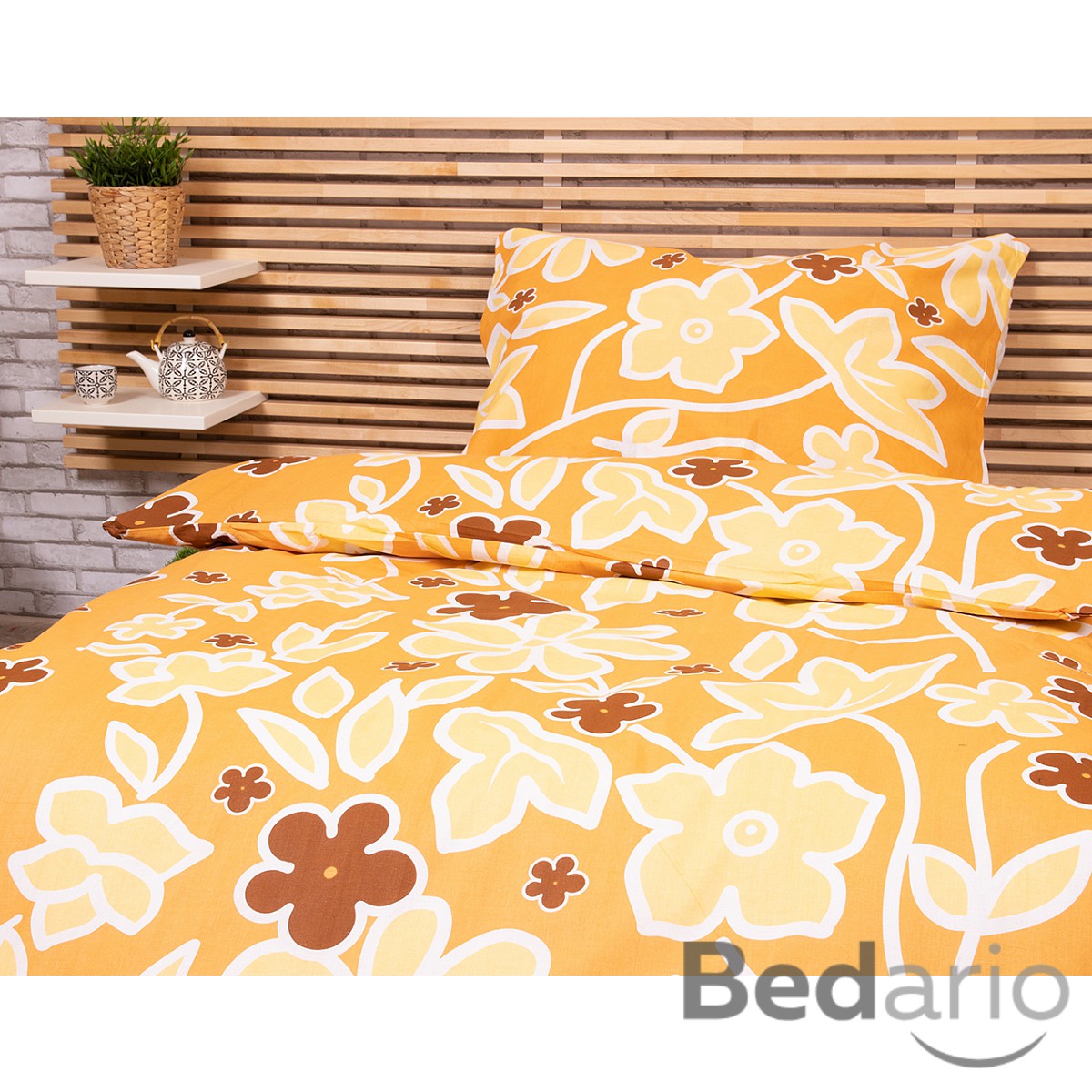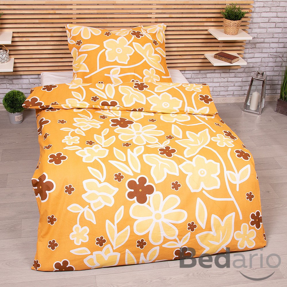 Zářivě žluté květy na oranžovém podkladě vnesou do vaší ložnice radost a letní náladu.