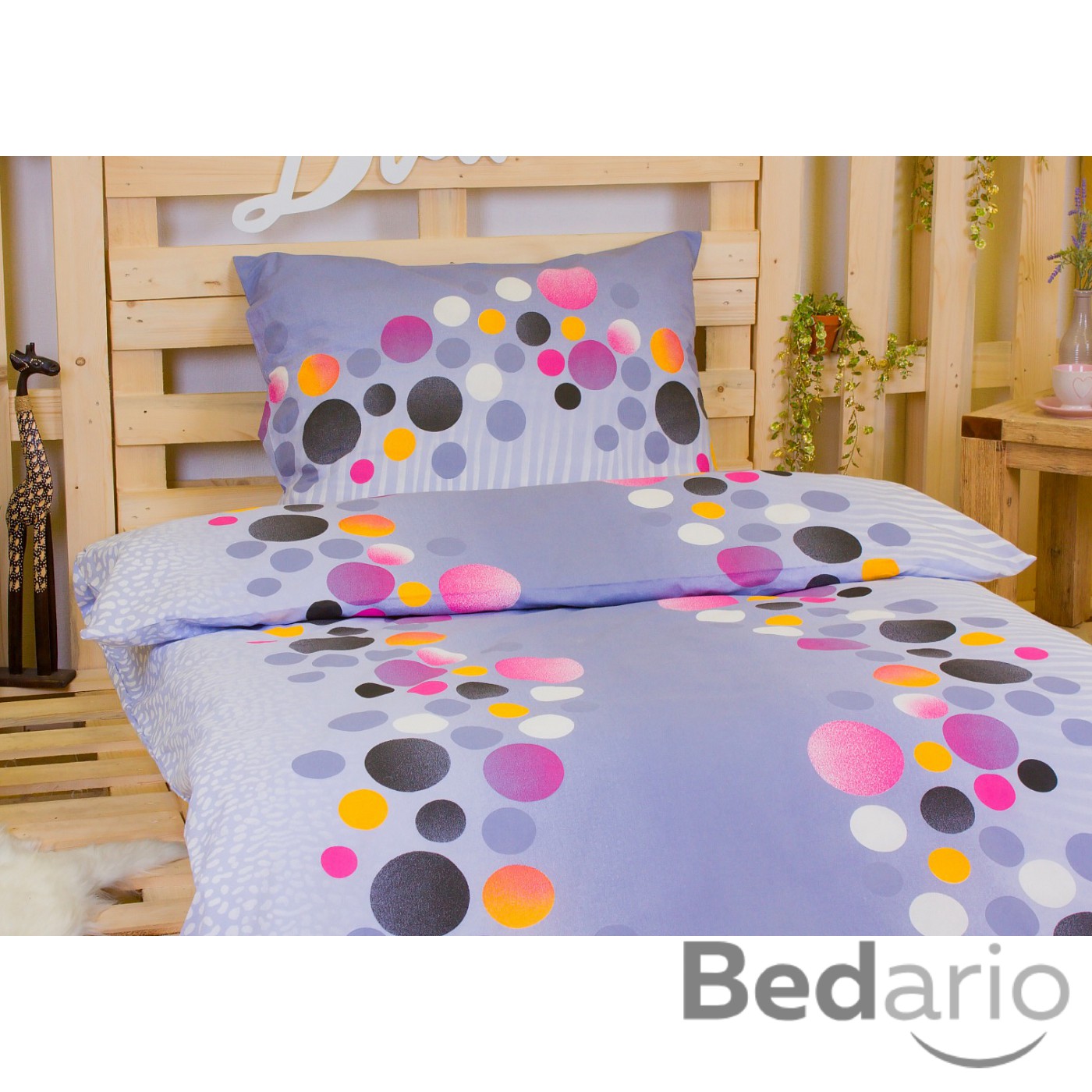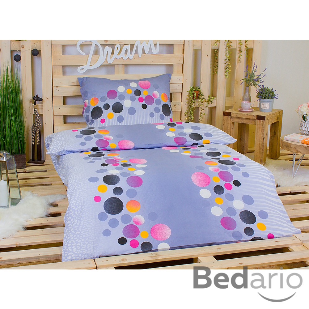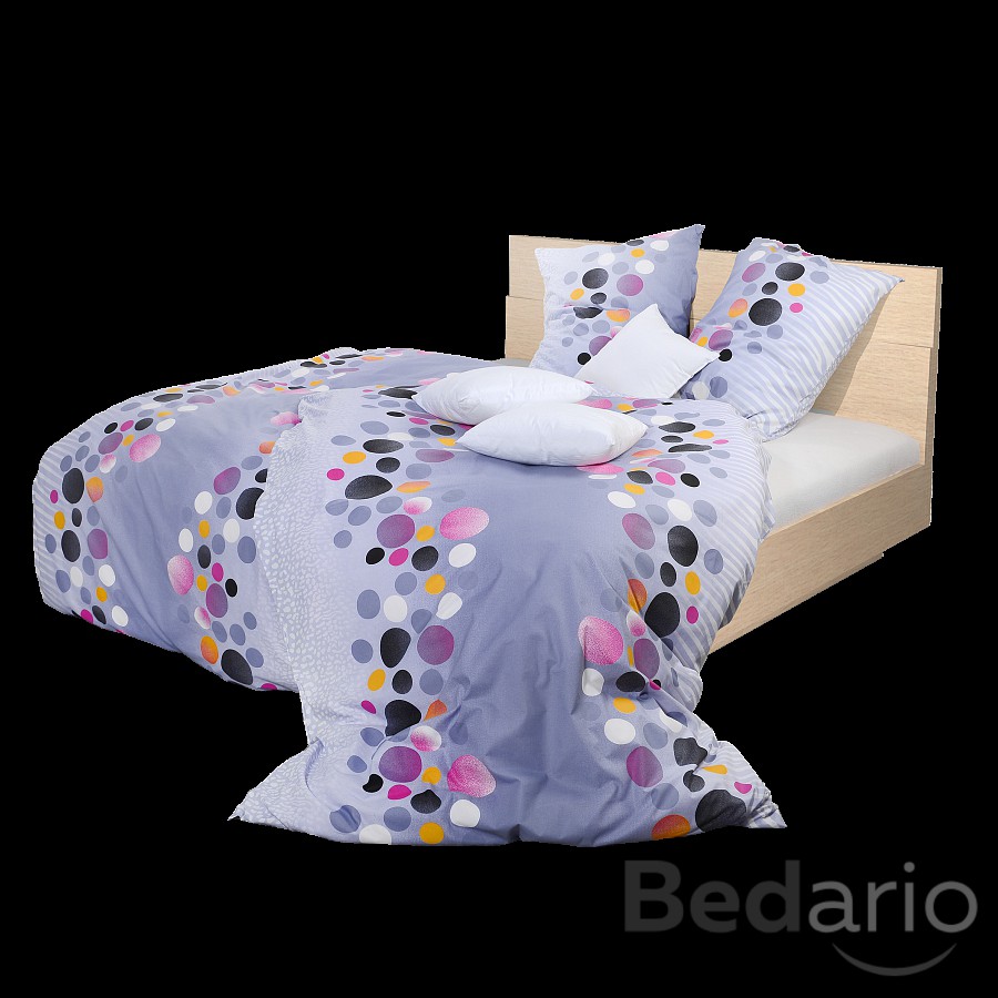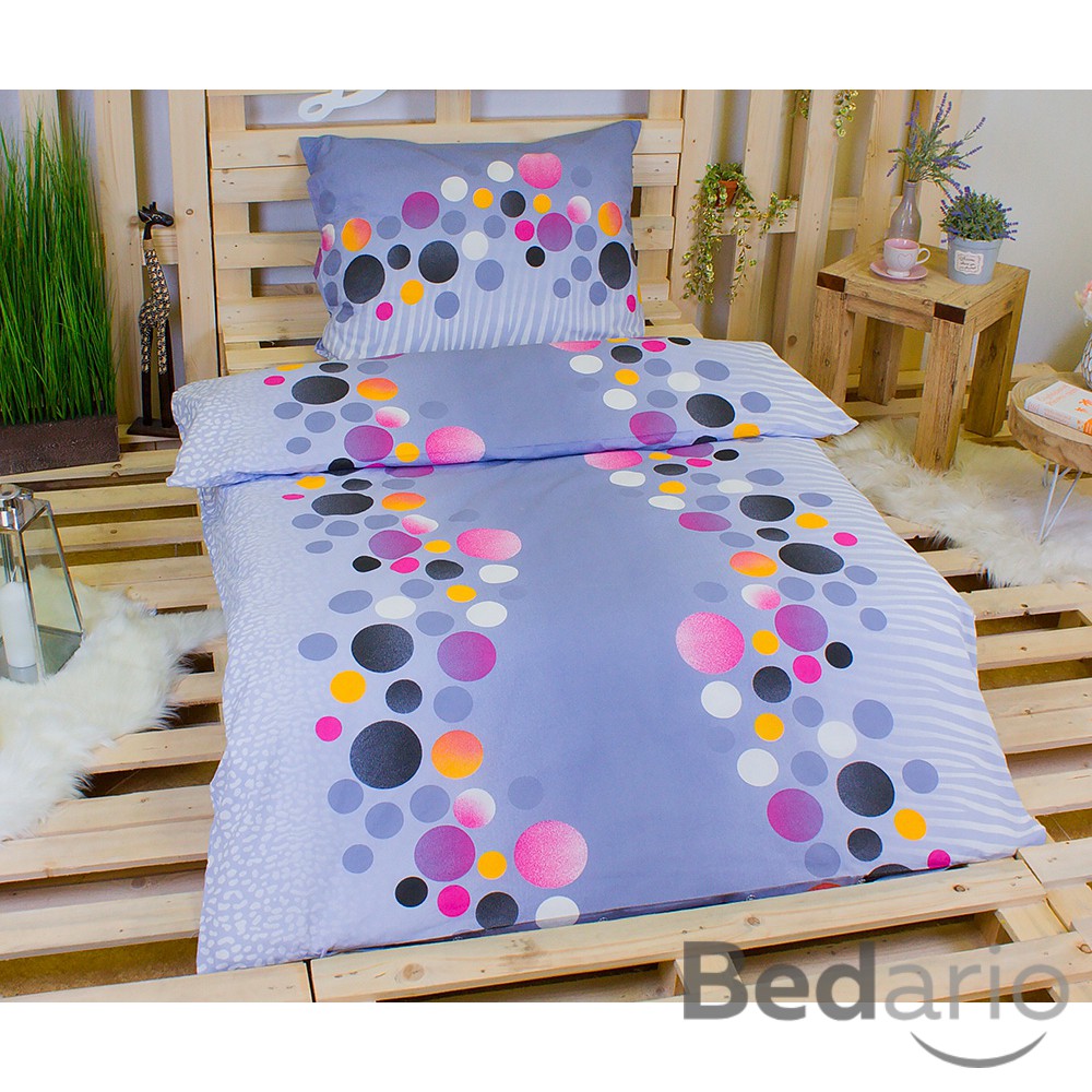 Mladistvé a trendy je ložní povlečení PUNTÍKY BAREVNÉ. Veselé puntíky mnoha velikostí a barev od černé, šedé, bílé, fialové, oranžové až po růžovou se vyjímají na decentním pozadí v šedém tónu. Polštáře i přikrývky mají z obou stran stejný vzhled.