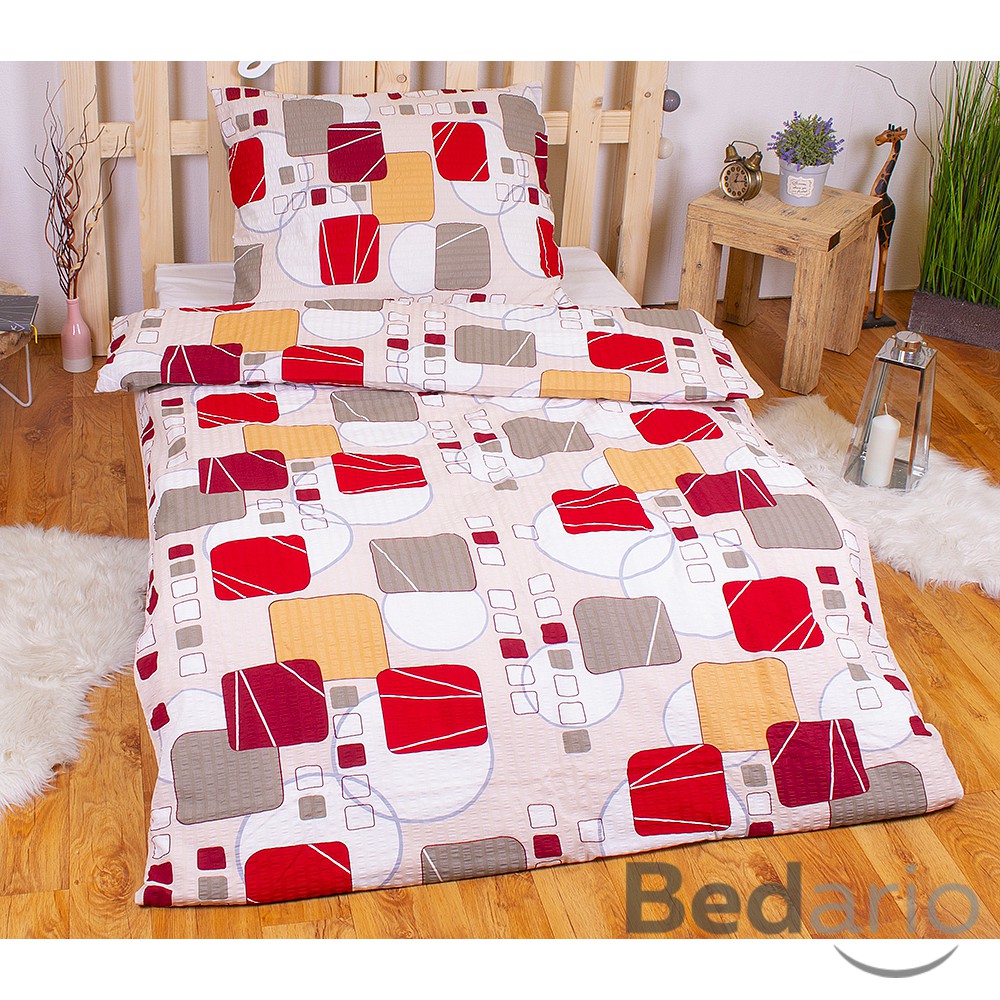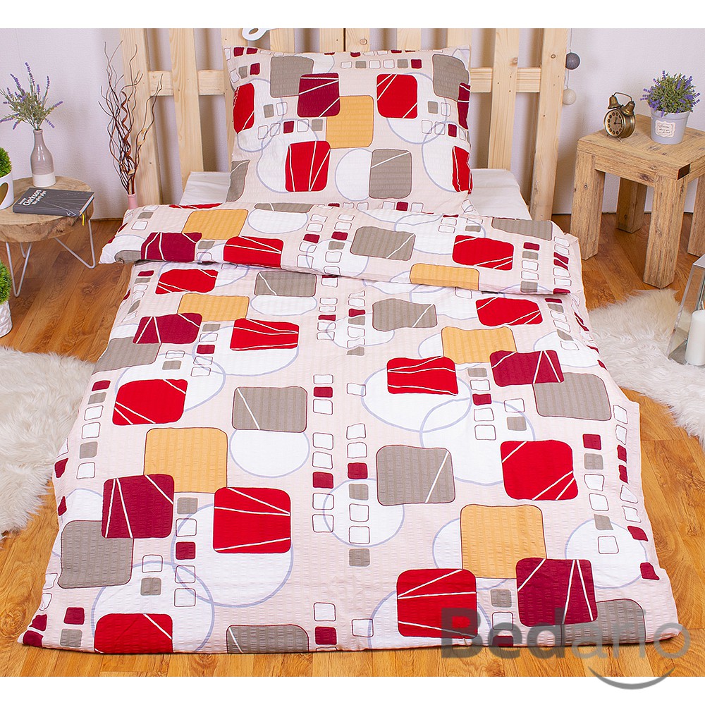 Trendy kostky cihlové, lososové, vínové a šedé barvy na světle béžovém podkladu – to je luxusní povlečení KARTY BAREVNÉ. Díky svému nadčasovému motivu se bude toto povlečení vyjímat ve všech interiérech. Polštáře i peřiny jsou z obou stran stejné.